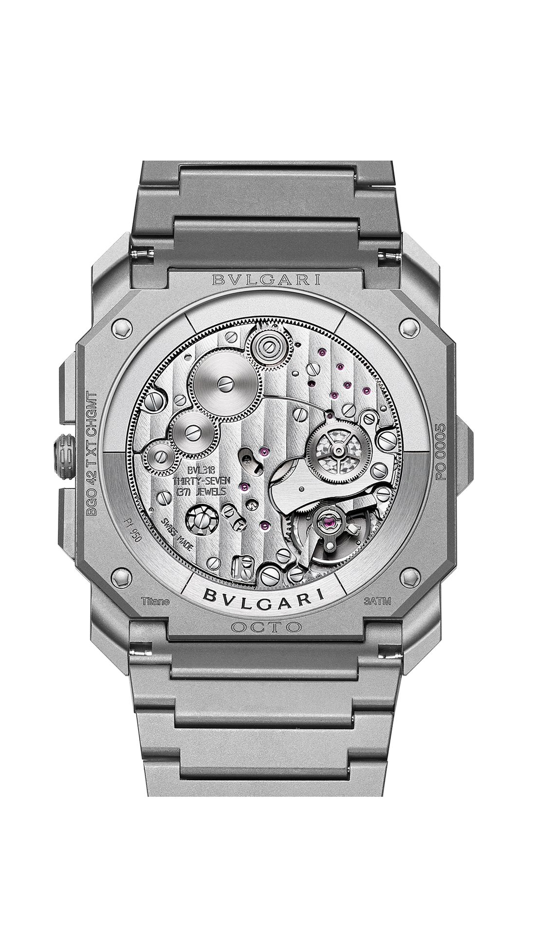 Die Octo Finissimo Chronograph GMT bietet die perfekte Mischung aus technischer Raffinesse und ästhetischer Eleganz. Als flachste Automatikuhr der Welt, die mit Chronograph und GMT-Funktion ausgestattet ist, nimmt sie eine führende Position in der heiß umkämpften Sparte der Luxus-Sportuhren ein.Das innovative Modell mit seiner zeitlosen monochromen Optik vereint den bekannten Chronographen mit einer GMT-Funktion, die zwei Zeitzonen gleichzeitig anzeigt – eine kreative Neuinterpretation mit italienischen Wurzeln. Octo Finissimo Chrono GMT Uhr mit extraflachem mechanischen Manufakturwerk mit Chronograph und GMT-Funktion, Automatikaufzug mit peripherem Rotor, Kaliber BVL 318 (3,30 mm hoch), 55 Stunden Gangreserve. Extraflaches 42 mm Gehäuse aus Titan (6,90 mm hoch), transparenter Gehäuseboden, Titankrone mit Keramik-Intarsie, Zifferblatt sowie Armband und Faltschließe aus sandgestrahltem Titan. Wasserdicht bis 30 Meter.