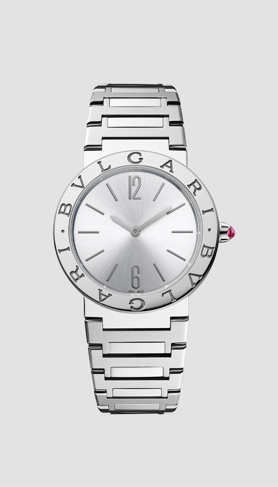 BULGARI BULGARI LADY Uhr mit Quarzwerk, 33 mm Gehäuse aus Edelstahl, Lünette aus Edelstahl mit graviertem Doppellogo, versilbertem Zifferblatt mit Sonnenschliff, Krone aus Edelstahl mit rosafarbenem Rubellit im Cabochonschliff und Armband aus Edelstahl. Wasserdicht bis 30 Meter.