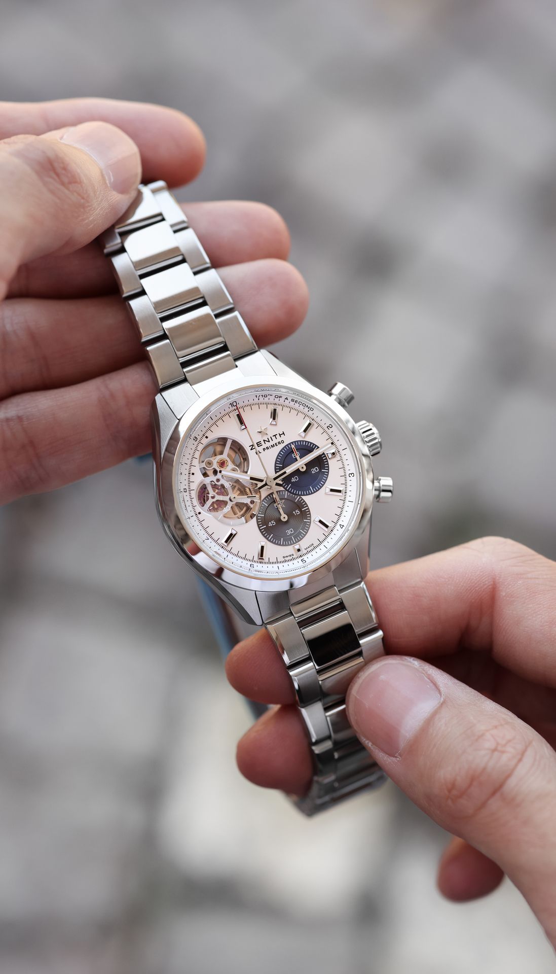 Die CHRONOMASTER Open bietet über das Zifferblatt einen Blick auf das schlagende Herz des Uhrwerks El Primero. Diese Version mit schlankem 39,5-mm-Edelstahlgehäuse verfügt über ein mattsilbernes Zifferblatt mit dreifarbigen Zählern und einem transparenten Zähler für die laufende Sekunde und ein integriertes Edelstahlarmband. Angetrieben vom automatischen 1/10-Sekunden-Chronographenwerk El Primero 3604.