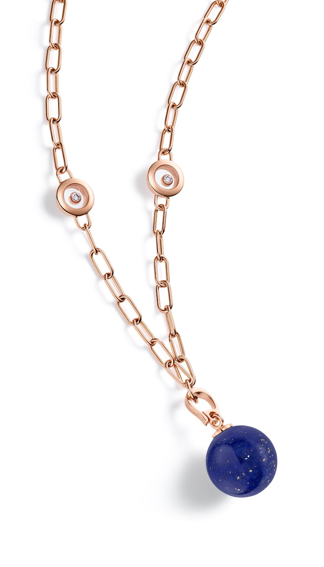 The Happy Diamonds rhodochrosite and diamond pendant is as unique as it is playful. The dancing diamonds are entirely free between two sapphire crystals, thus enabling them to move without restraint, and through this very movement to enhance their inherent sparkle. Little Diamonds Do Great Things.