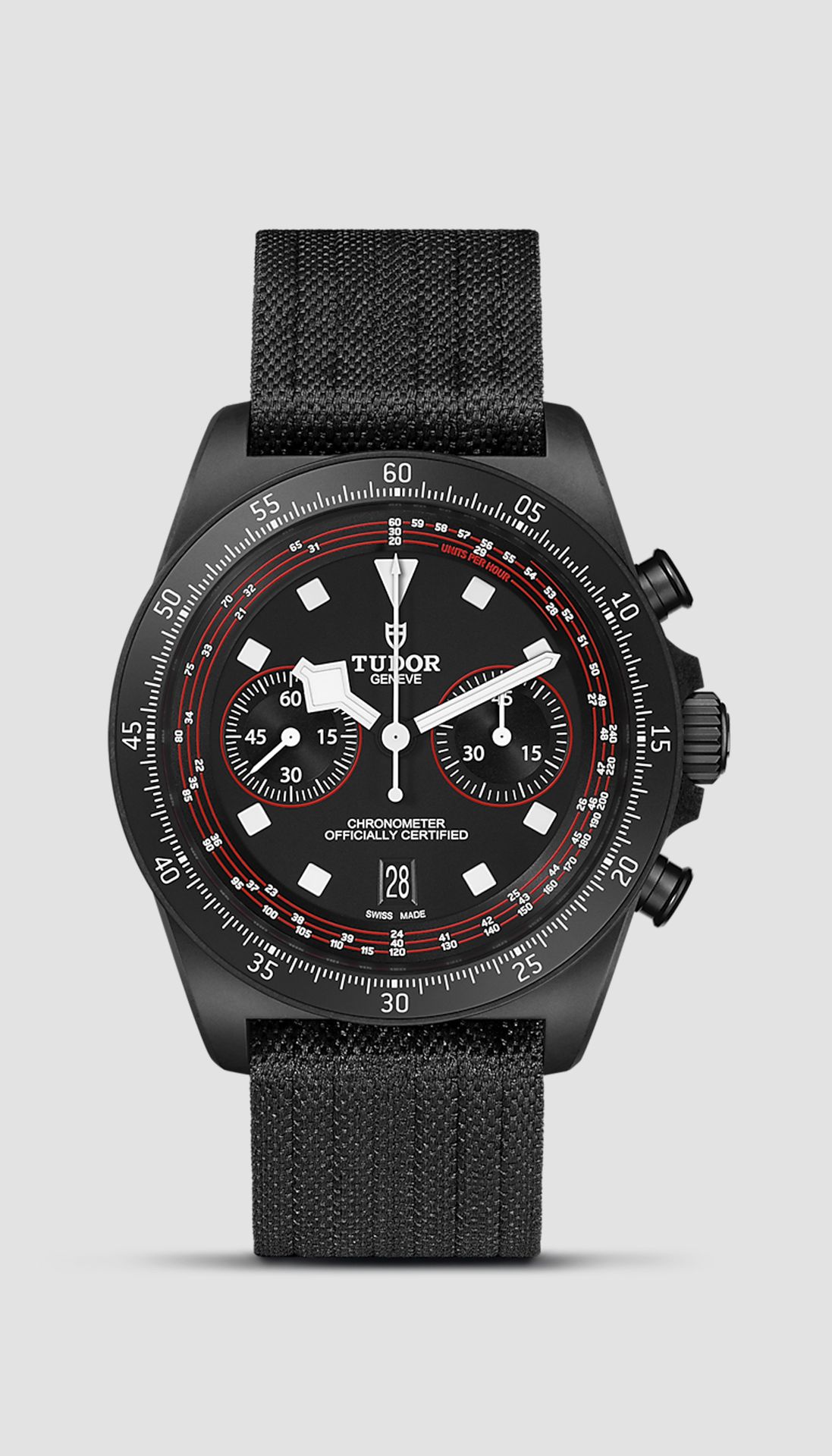 Beim mattschwarzen Zifferblatt mit roten Akzenten steht vor allem die Ablesbarkeit im Vordergrund. Seine Farbgebung erinnert an die Farben des TUDOR Pro Cycling Teams. Die charakteristischen quadratischen Stundenindizes und „Snowflake“-Zeiger, die in den 1960er-Jahren von TUDOR entworfen wurden, sind aus leuchtender Monoblock-Keramik hergestellt, die eine optimale Ablesbarkeit unter herausfordernden Bedingungen garantiert. Auf dem 45°-Rehaut, der um das Zifferblatt herumläuft, befindet sich eine rekalibrierte Tachymeterskala, deren Innenring die von Radfahrern erreichten Geschwindigkeiten anzeigt.