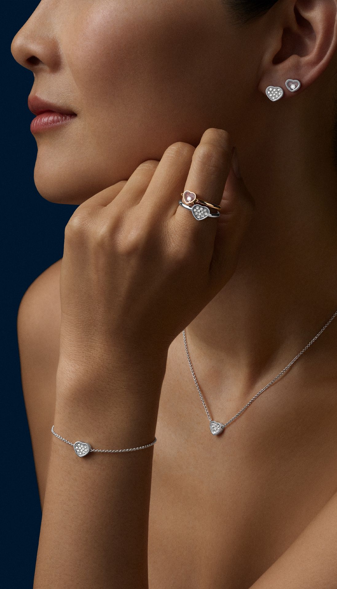 My Happy Hearts jewelry collection borrows its most famous codes, the heart and mobile diamonds, from Chopard's legendary creations. The heart motifs of My Happy Hearts diamond rings form a delicate constellation, to be worn alone or stacked as a stylish accessory. Me, Myself and My Happy Hearts.