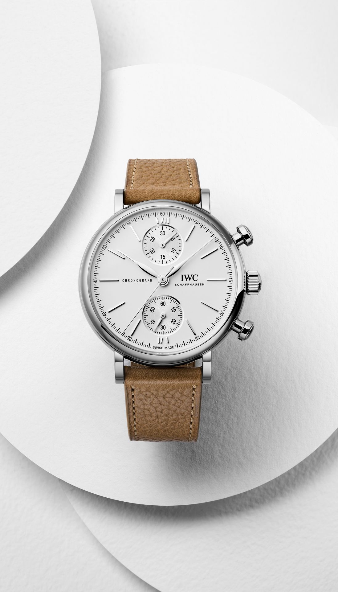 The Portofino Chronograph 39 combines classic and elegant Portofino design with a sporty chronograph complication. Its slightly reduced case diameter of 39 millimetres ensures excellent wearability even on more slender wrists. This version features a stainless steel case. The rhodium-plated hands and appliques harmonize beautifully with the silver-plated dial. At work inside the case is the IWC-manufactured 69355 calibre chronograph movement, enabling the measurement of stop times of up to 30 minutes. The chronograph in classic column-wheel design is visible through the sapphire glass case back. Sporty and elegant at once, this timepiece is fitted with a beige calfskin strap. Thanks to the integrated quick-change system, the strap can be exchanged in no time at all.