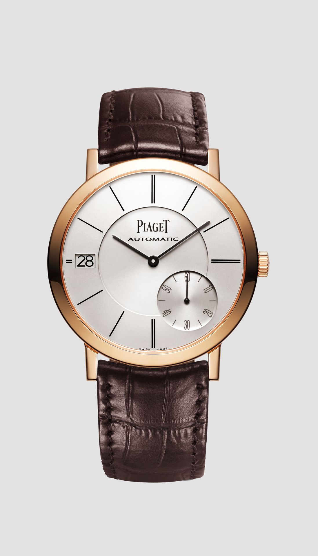 Das 40 mm-Gehäuse aus Roségold wurde speziell für das Kaliber 1205P mit Datumsanzeige und kleiner Sekunde konzipiert. Das auf drei Ebenen angeordnete Zifferblatt mit seinem Wechselspiel von einfachen und doppelten Indexen übernimmt die ästhetischen Grundwerte der ultraflachen Piaget Automatikuhren. Eine zeitlos puristische und elegante Luxusuhr für Männer, ein echter Uhrmacherklassiker, der auch in den kommenden Epochen niemals aus der Mode kommen wird.