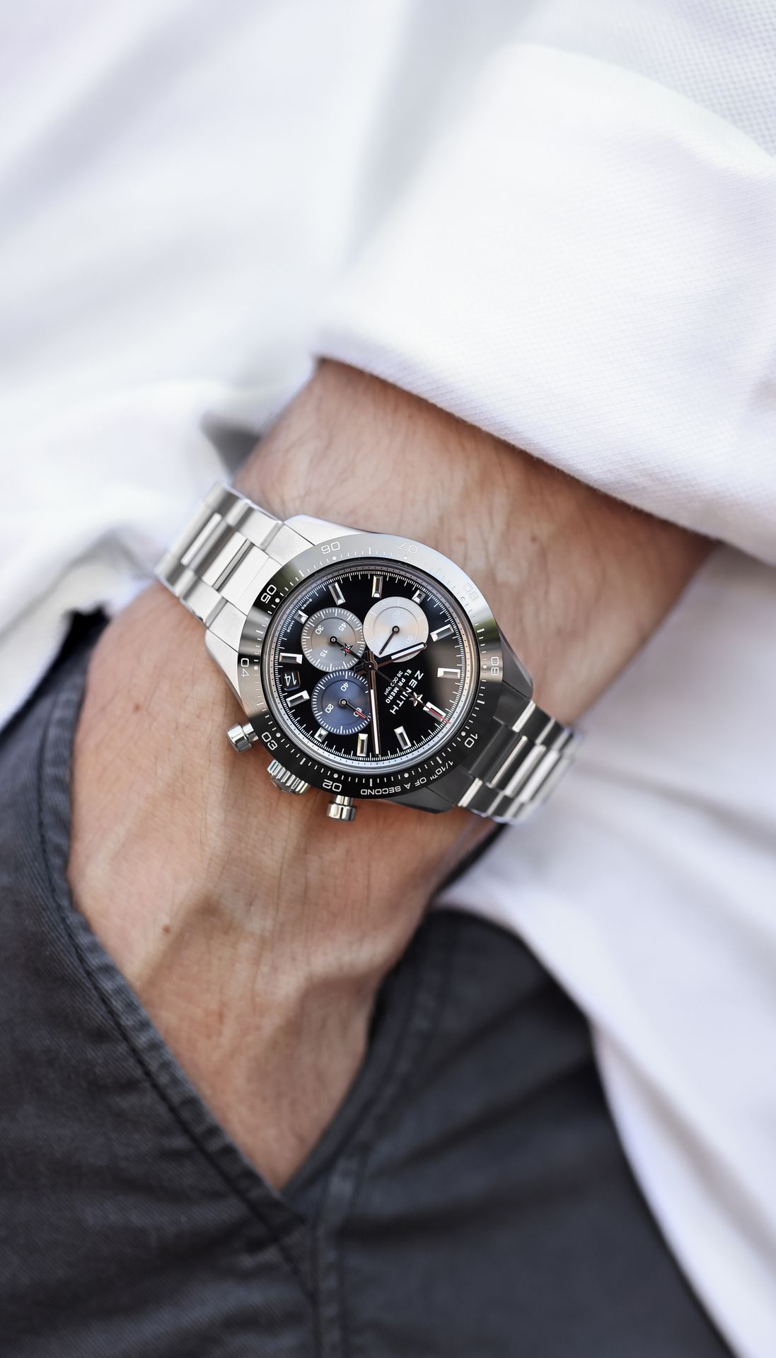 The CHRONOMASTER Sport combines elements of past ZENITH chronograph references such as the tri-colour dial, pump-style pushers and steel bracelet with a black ceramic bezel, all in a modern 41mm case. This version features a black dial paired with an integrated steel bracelet. Powered by the El Primero 3600 1/10th of a second automatic chronograph movement.
