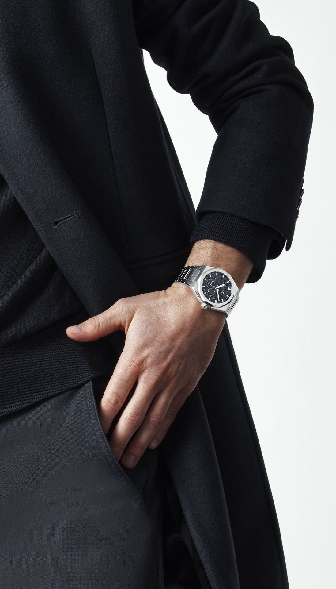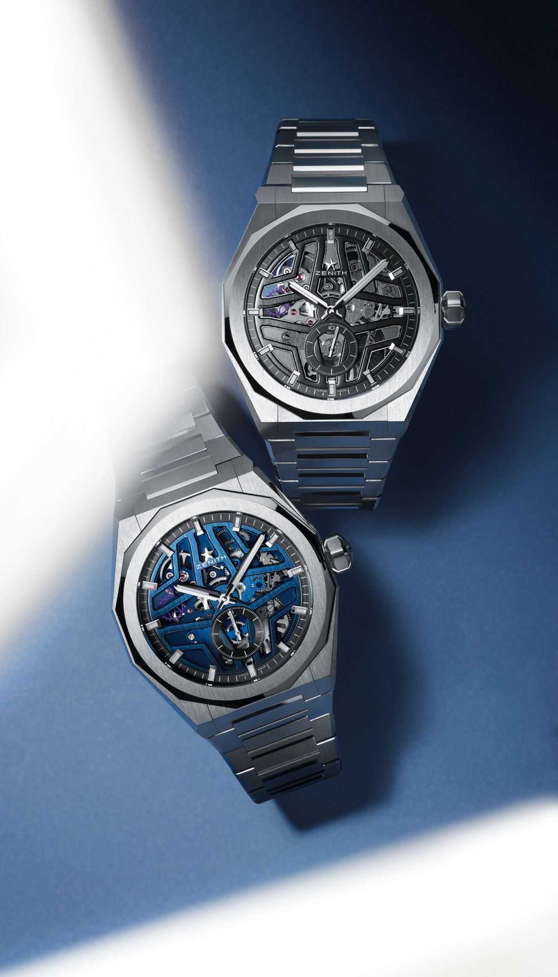 DEFY Skyline Skeleton in a 41mm steel octagonal case with a faceted bezel, featuring a blue open dial revisiting the emblematic ZENITH four-pointed star. Powered by the El Primero 3620 SK high-frequency automatic manufacture skeleton movement with the very first 1/10th of a second indicator. Interchangeable steel bracelet and blue patterned rubber strap.