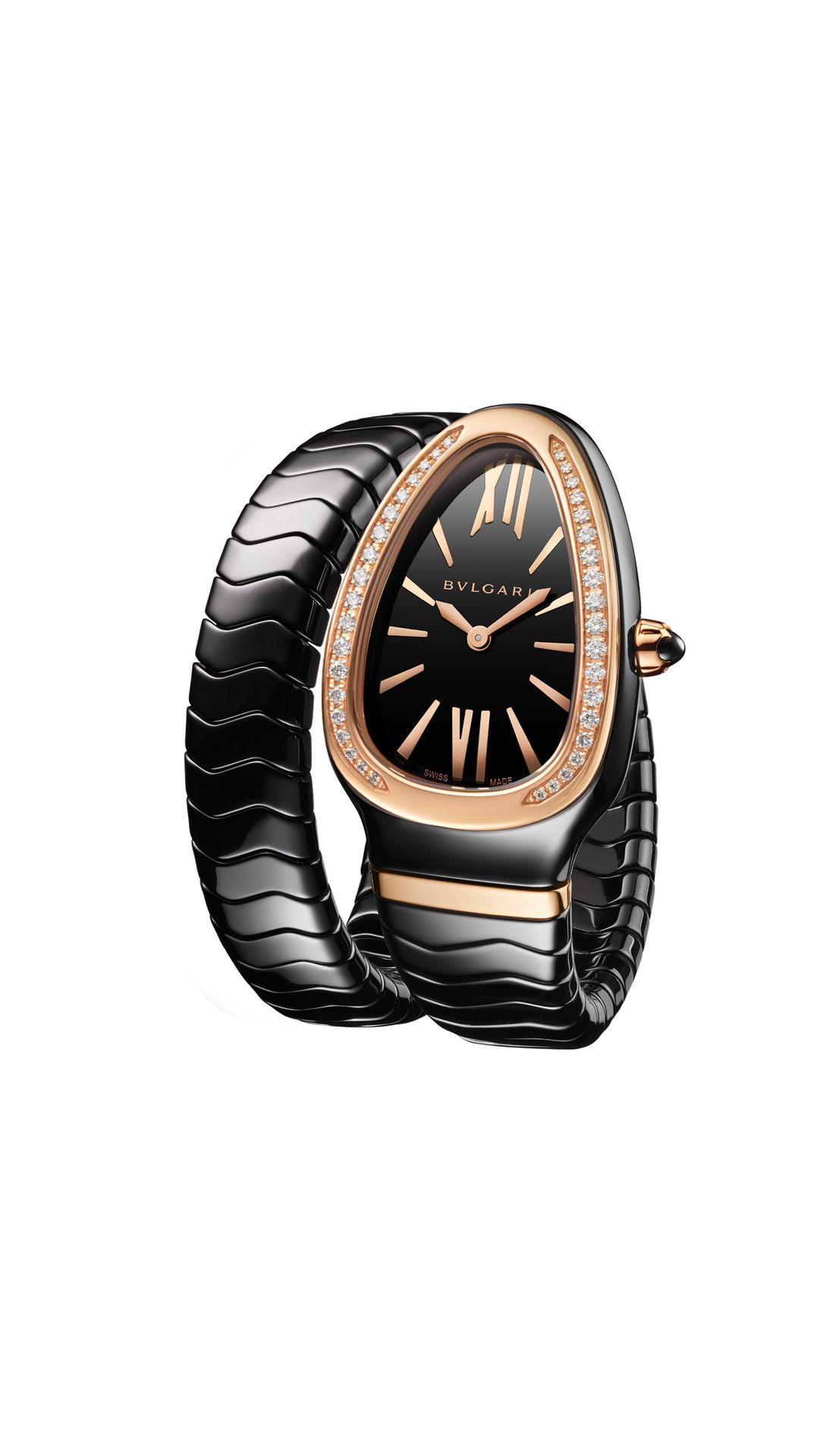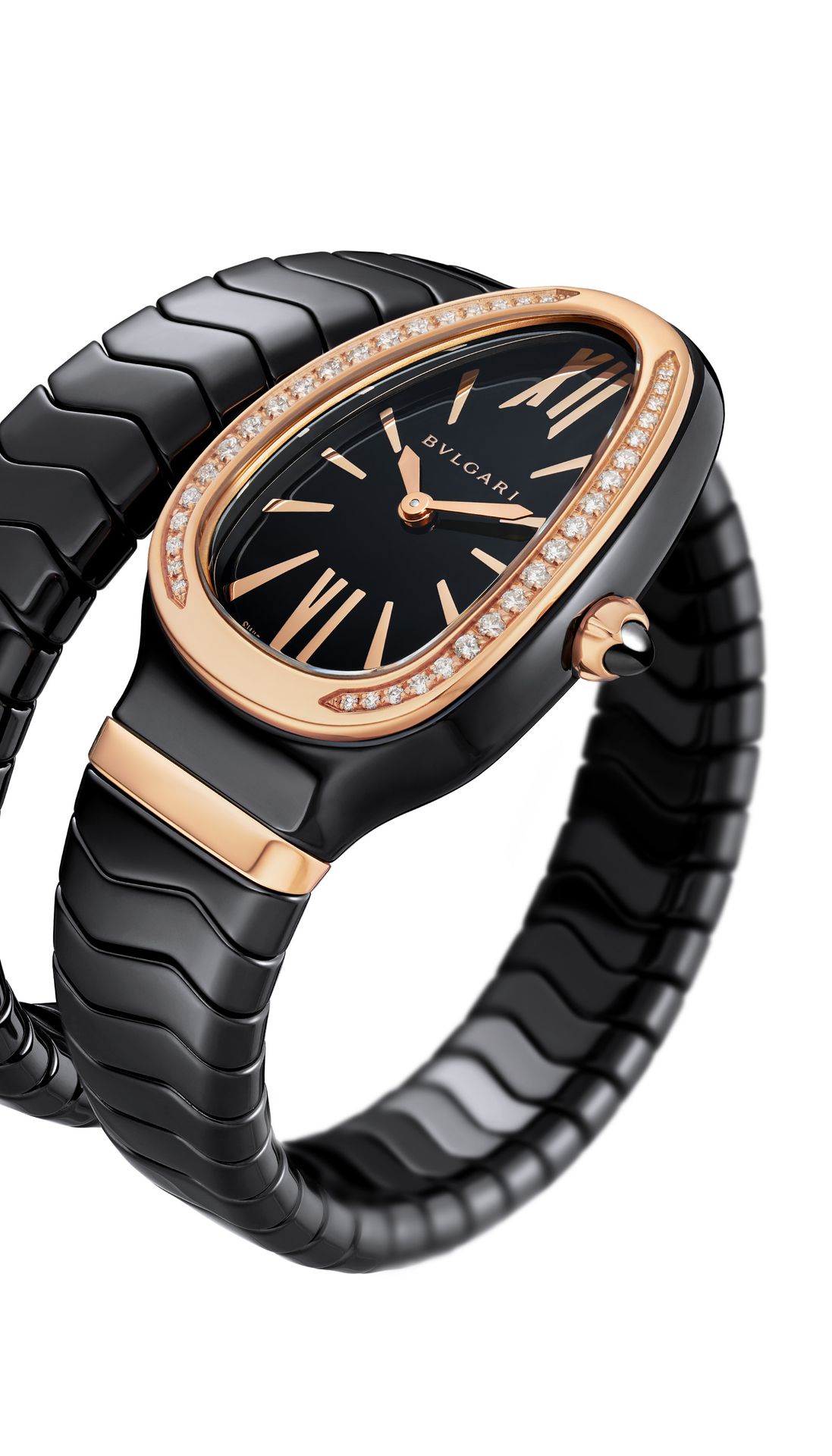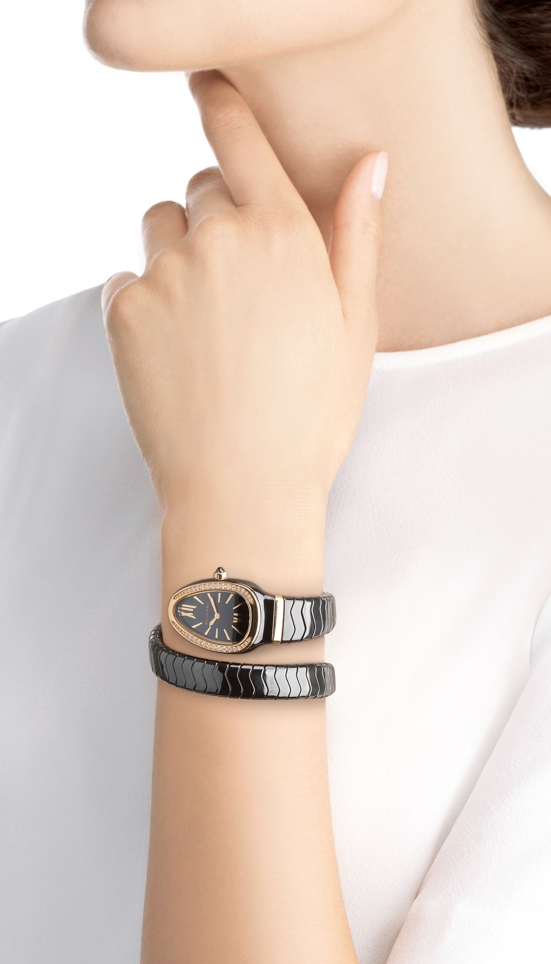Serpenti Spiga watch with quartz movement, 35 mm black ceramic curved case, 18 kt rose gold bezel set with brilliant cut diamonds, 18 kt rose gold crown set with a cabochon cut ceramic element, black lacquered polished dial, black ceramic single spiral bracelet with 18 kt rose gold elements.
