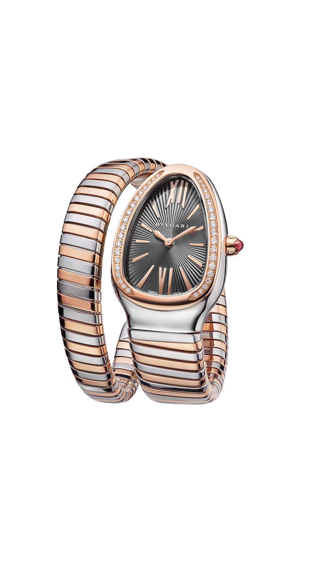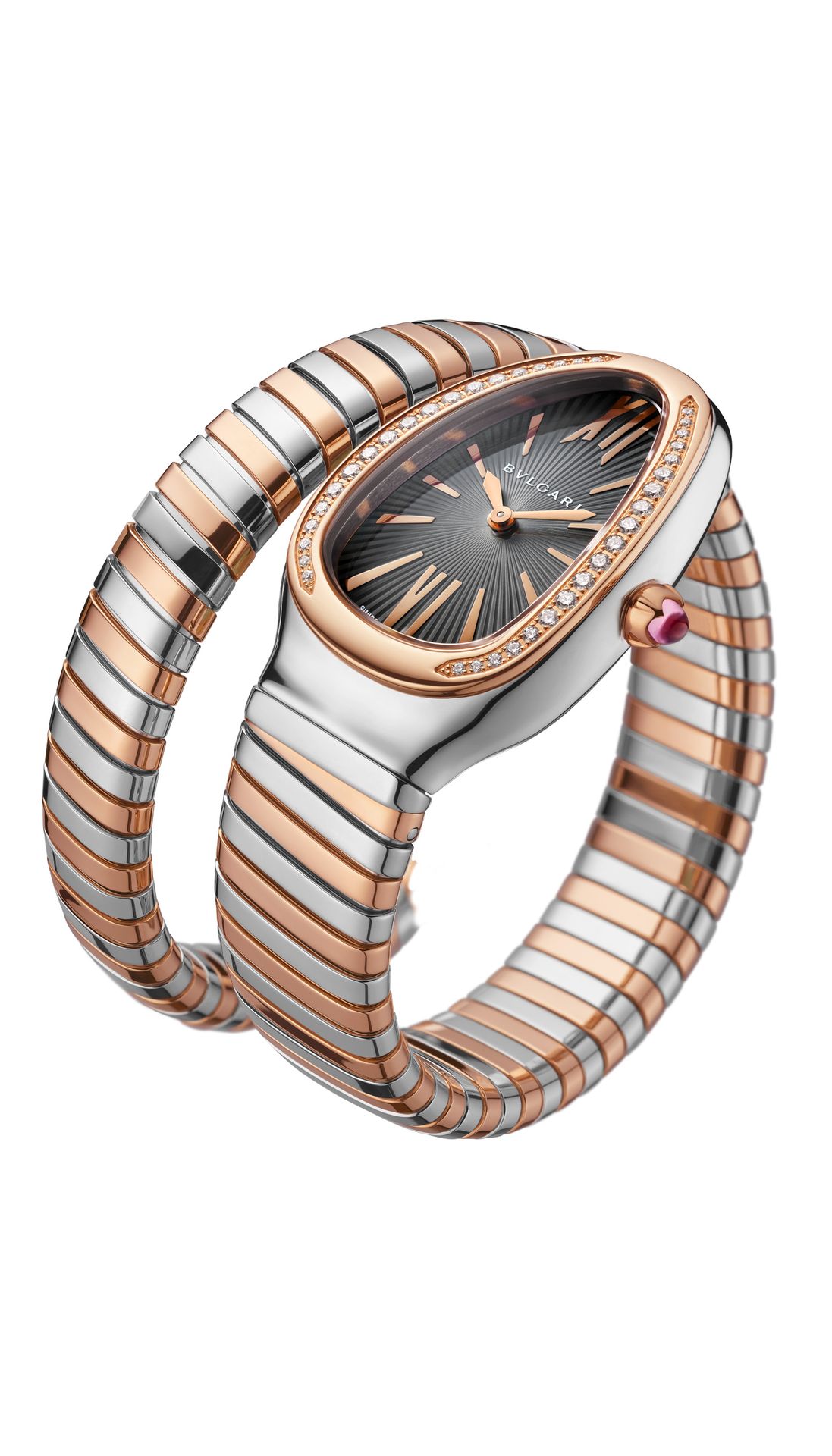 Serpenti Tubogas watch with quartz movement, 35 mm stainless steel curved case, 18 kt rose gold bezel set with brilliant cut diamonds, 18 kt rose gold crown set with a cabochon cut pink rubellite, grey lacquered dial with guilloché soleil treatment, 18 kt rose gold and stainless steel single bracelet.
