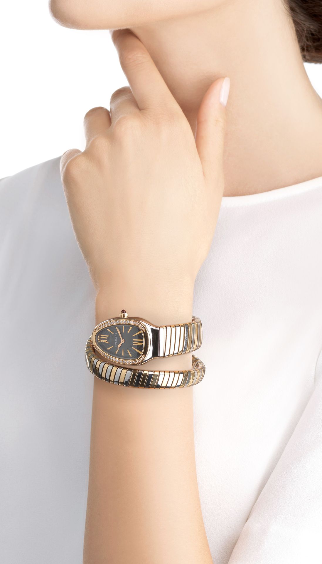 Merging two of the most iconic symbols of Bulgari design, the Serpenti Tubogas watch coils the sinuosity of the snake with the contemporary soul of tubogas. Evoking both the sensual curves of a woman and the fluid shape of the serpent, the timepiece is crafted with the shapely lines of this specific technique, with a flexible and tubular litheness. Radiating glamour and a truly individual style, this watch marks a distinctive chapter in the constant evolution of Serpenti.