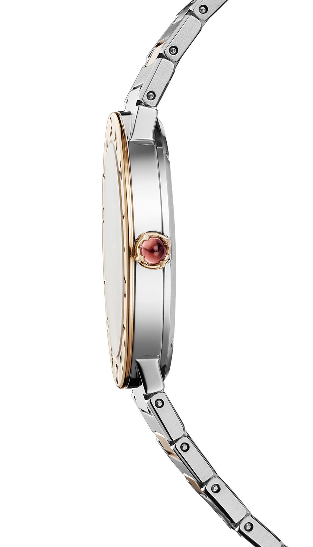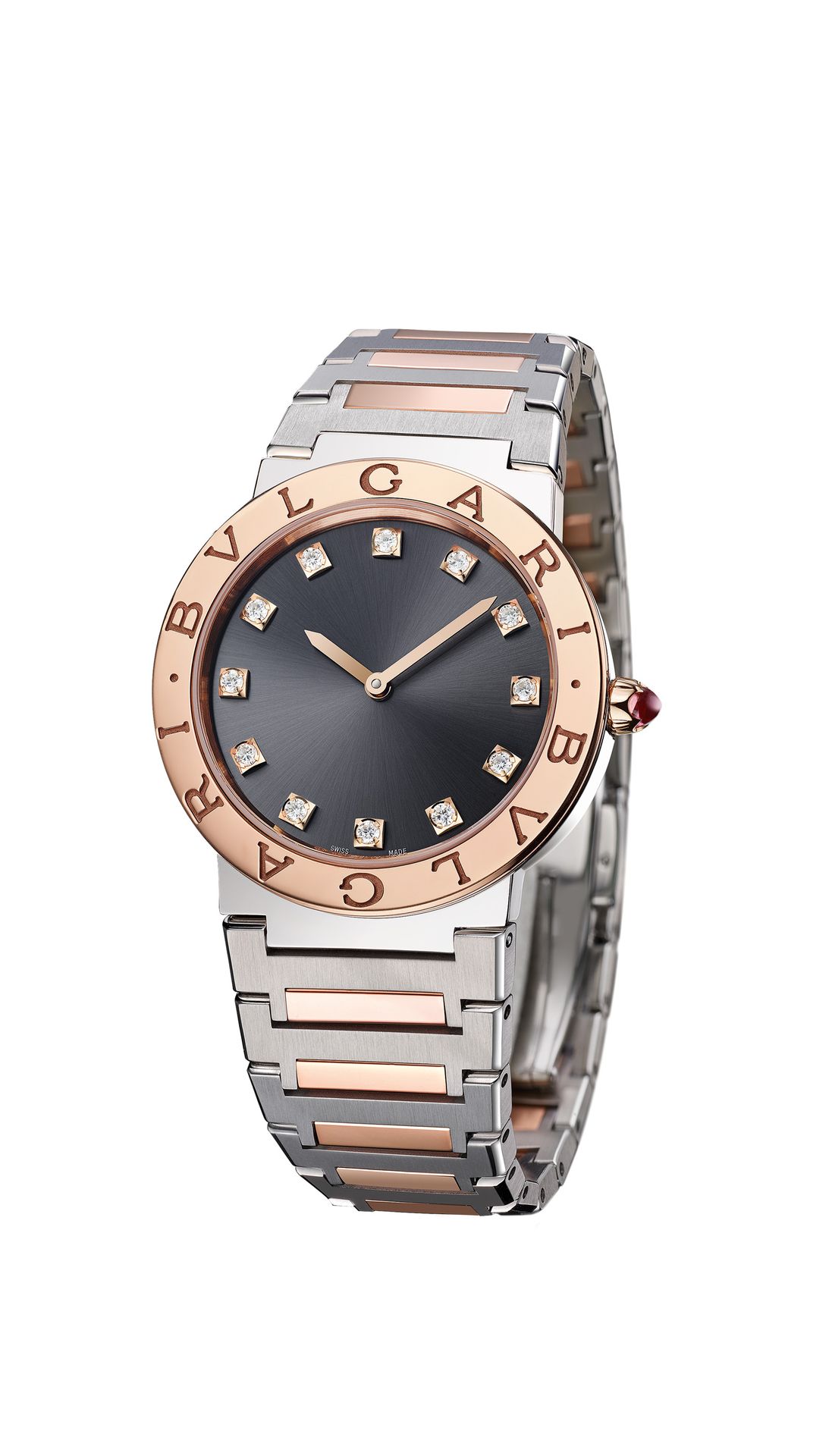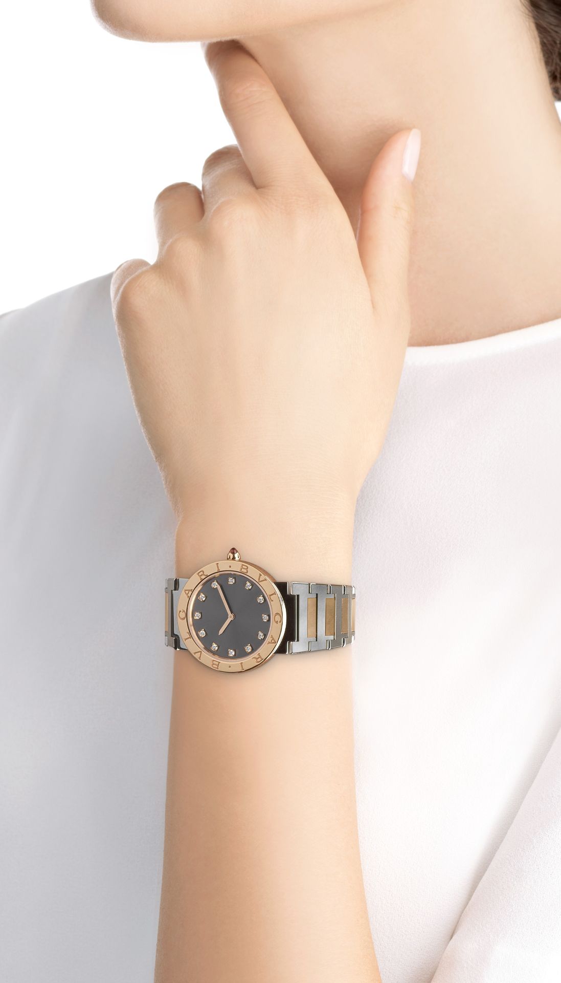 BVLGARI BVLGARI LADY watch with quartz movement, 33 mm stainless steel case, 18 kt rose gold bezel with logo, 18 kt rose gold crown set with a pink cabochon-cut stone, grey lacquered dial, diamond indexes, and stainless steel and 18 kt rose gold bracelet.