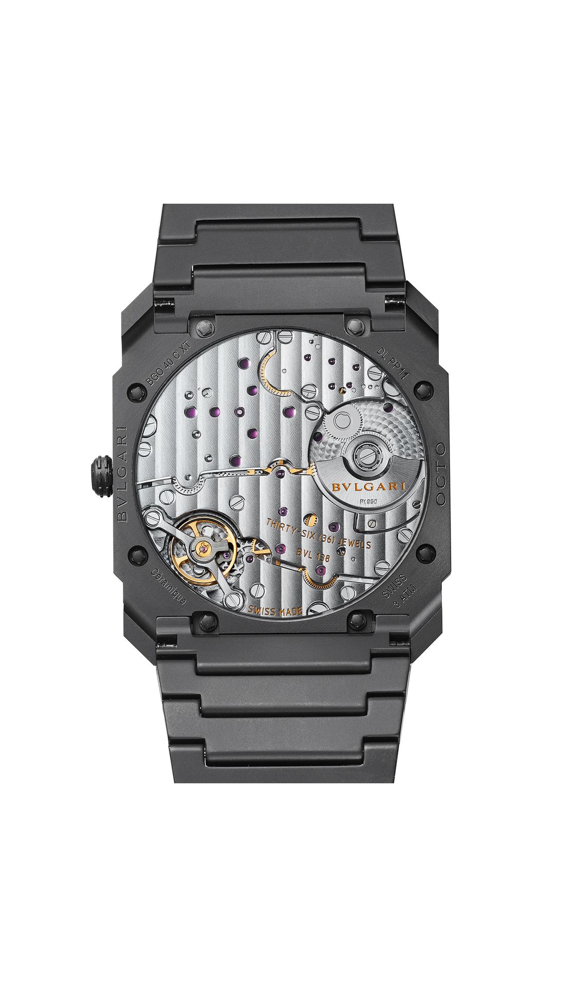 Octo Finissimo Automatic watch with extra-thin mechanical manufacture movement, automatic winding with platinum microrotor, small seconds, BVL 138 - Finissimo caliber (2.23 mm thick) decorated by hand with côtes de Genève, chamfering and perlage finishing. 60 hours power reserve. 40 mm extra-thin ceramic case (5.50 mm thick), transparent case back, ceramic crown set with ceramic element, ceramic dial and ceramic bracelet with folding clasp. Water-resistant up to 30 metres.