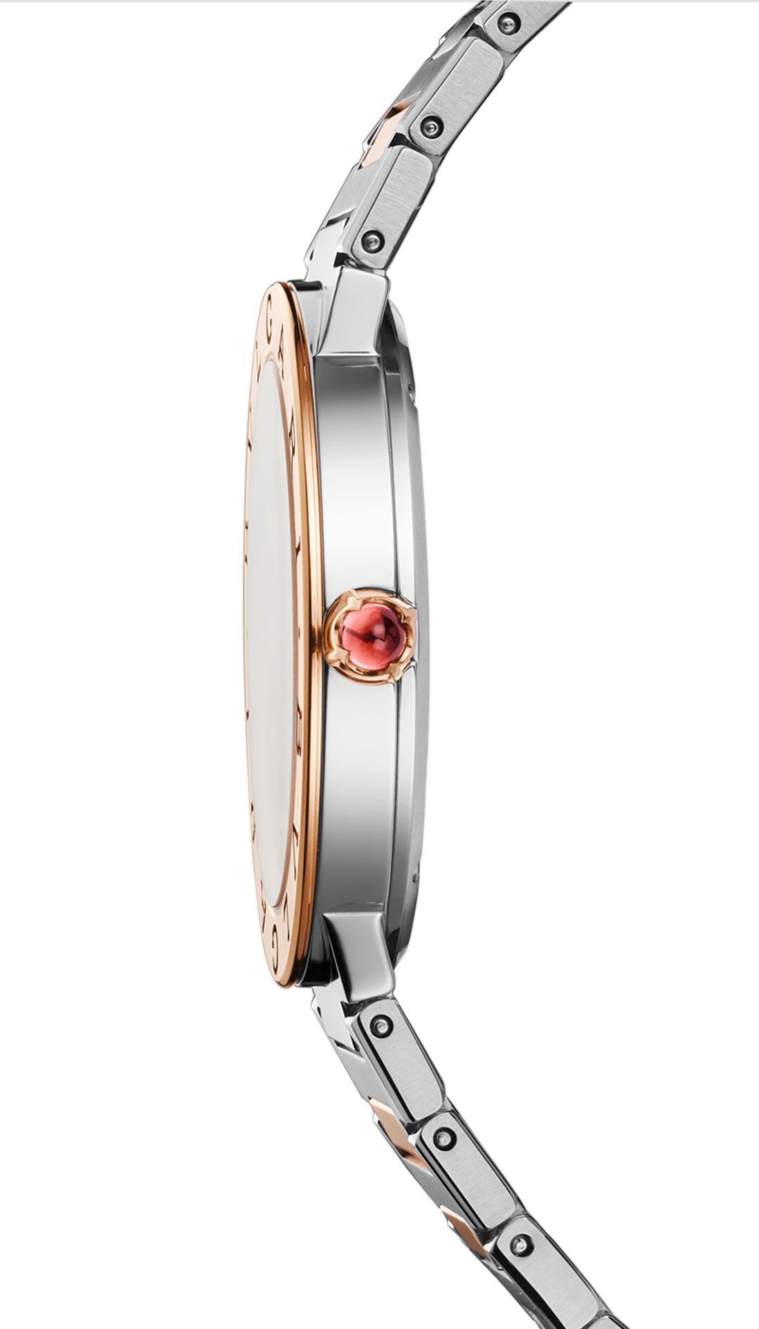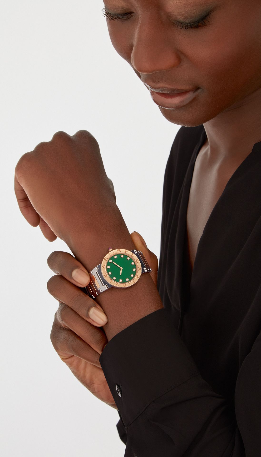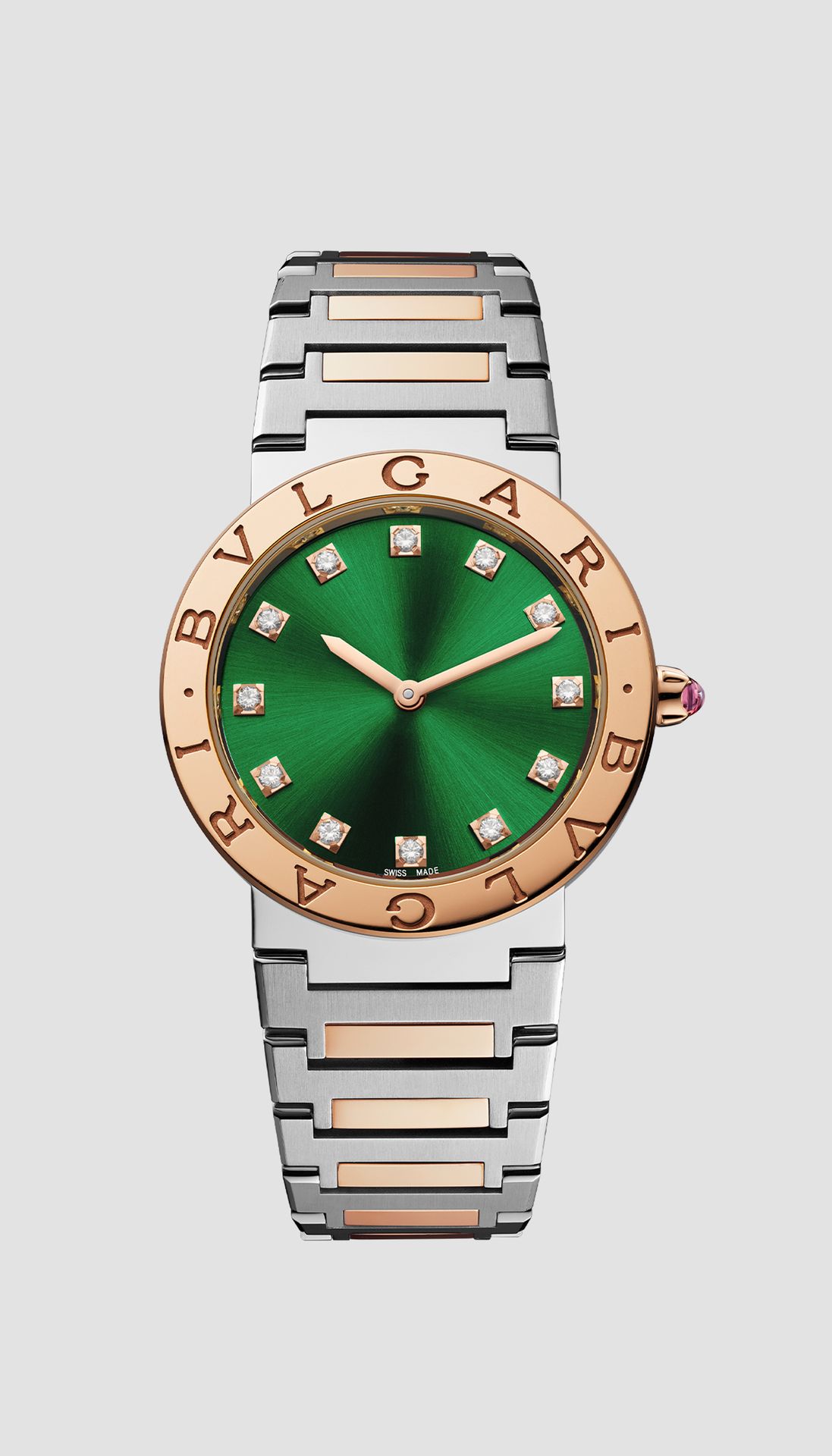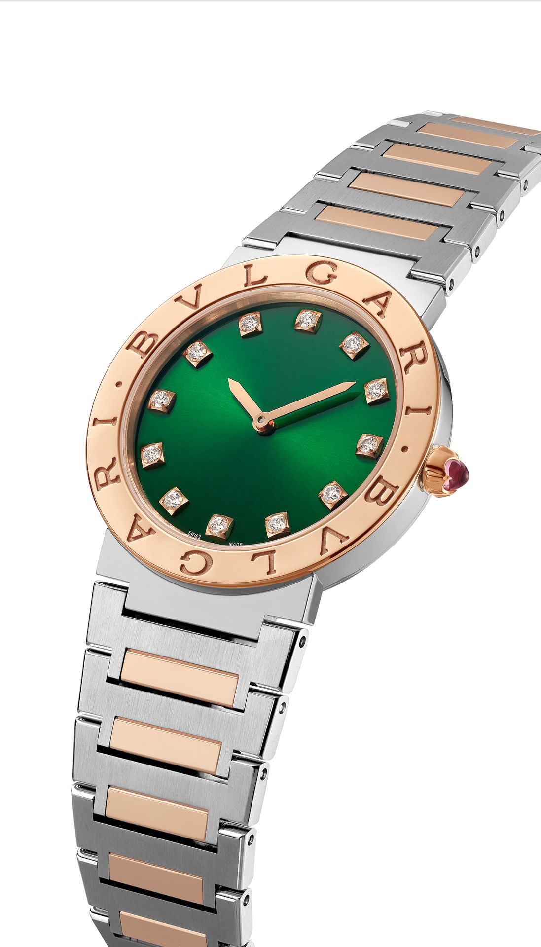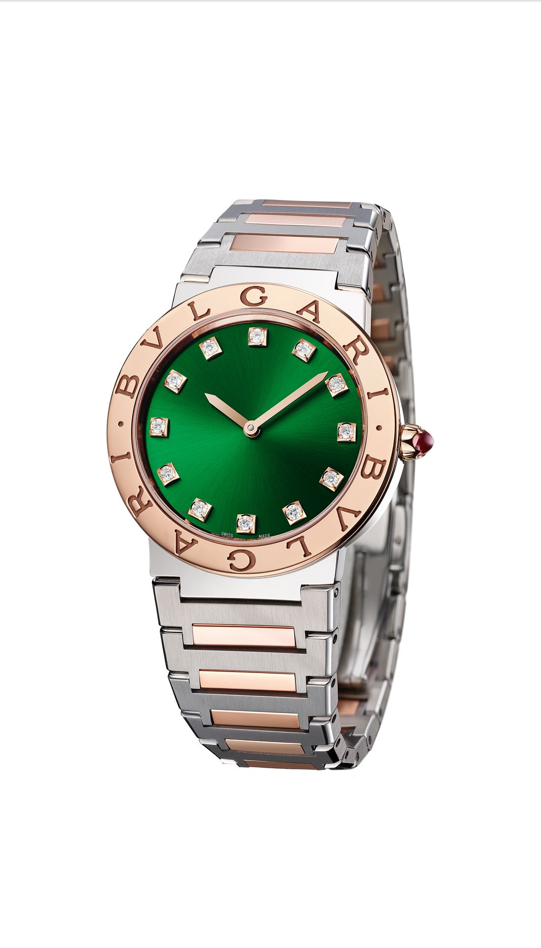 BVLGARI BVLGARI watch with quartz movement, 33 mm 18 kt rose gold and stainless steel case, 18 kt rose gold crown set with a pink cabochon-cut stone, 18 kt rose gold bezel engraved with double logo, green satiné soleil lacquered dial, diamond indexes, stainless steel and 18 kt rose gold bracelet with folding buckle. Water-resistant up to 30 metres.