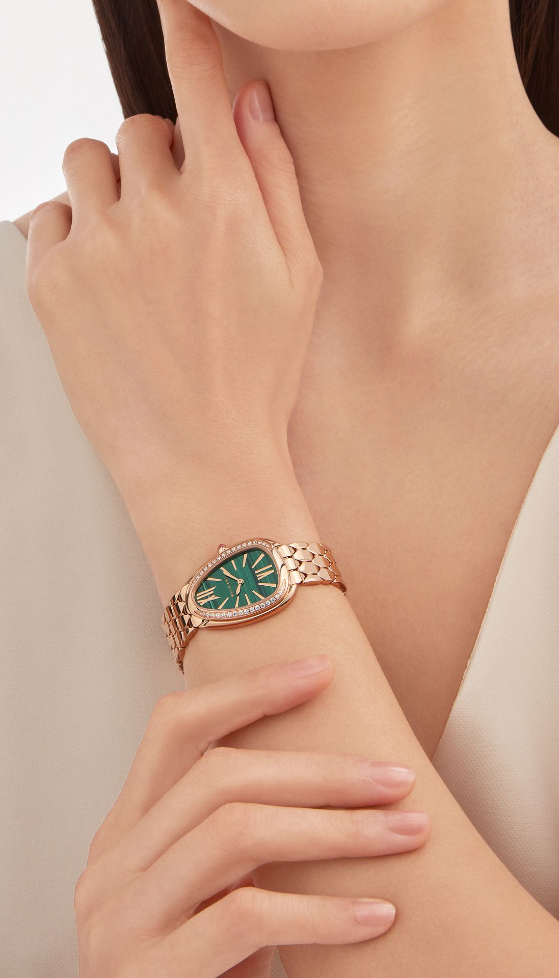 Gleaming with the refined sheen of its sparkling materials, the Serpenti Seduttori watch makes time even more precious. Reimagining Bvlgari’s indisputably seductive icon with a striking new design, the timepiece boasts the iconic drop-shaped watch head, thinner than ever before, with a sensual, flexible bracelet featuring a hexagonal pattern inspired by the scales of a serpent. With its alluring aesthetics and a nod to the glamour of high jewellery, the watch casts a spell of seduction on the world of Serpenti.