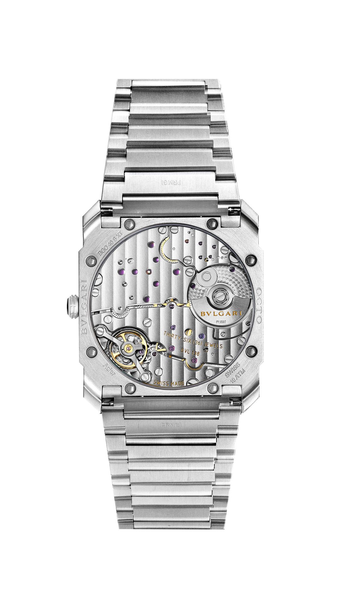 Octo Finissimo Automatic watch with mechanical manufacture movement, automatic winding, platinum microrotor and small seconds. BVL 138 caliber, 40 mm extra-thin satin-polished stainless steel case (6.40 mm thick), transparent case back, polished stainless steel screw-down crown set with ceramic insert, blue laquered dial with sunburst finishing, integrated satin-polished stainless steel bracelet with folding clasp. Water-resistant up to 100 metres.