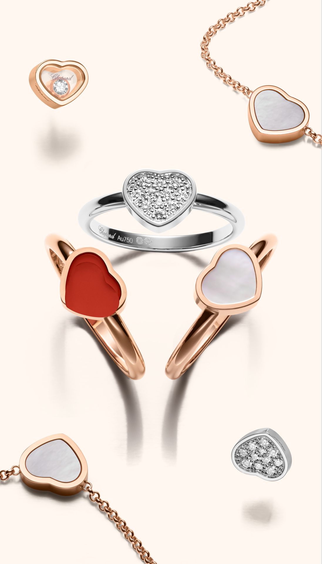My Happy Hearts jewelry collection borrows its most famous codes, the heart and mobile diamonds, from Chopard's legendary creations. The heart motifs of My Happy Hearts diamond rings form a delicate constellation, to be worn alone or stacked as a stylish accessory. Me, Myself and My Happy Hearts.