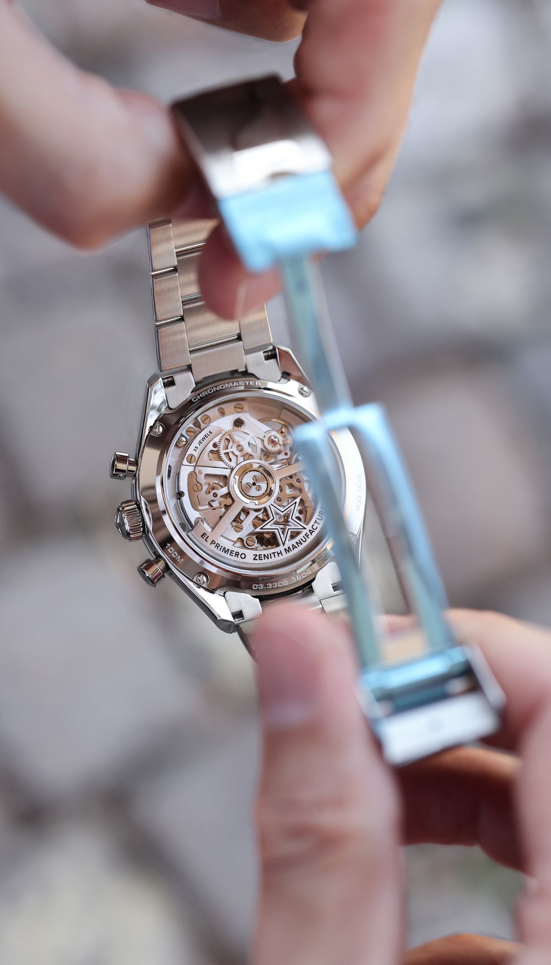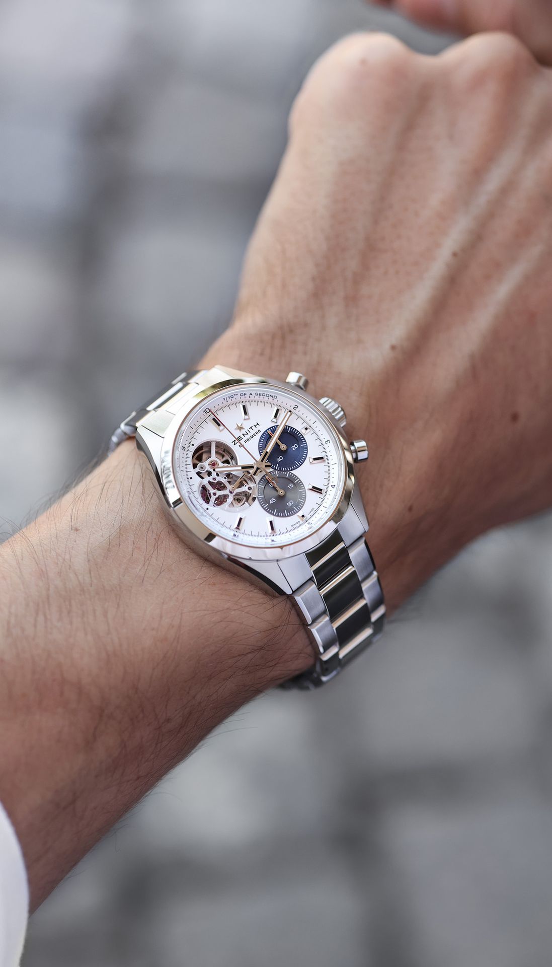 The CHRONOMASTER Open offers a view of the beating heart of the El Primero movement from the dial. Crafted in a sleek 39.5mm steel case, this version features a matte silver dial with tricolour counters and a transparent counter for the running seconds, paired with an integrated steel bracelet. Powered by the El Primero 3604 1/10th of a second automatic chronograph movement.