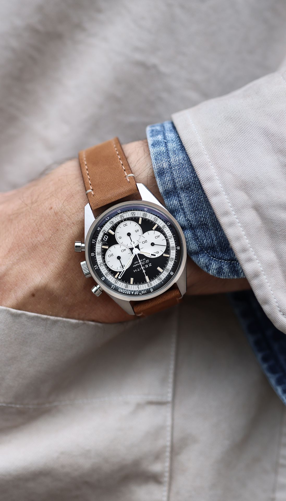 The CHRONOMASTER Original is crafted in a 38mm steel case in the same proportions as the A386, paired with a black "reverse panda" dial and a tan leather strap. Powered by the El Primero 3600 automatic high-frequency chronograph movement with 1/10th of a second chronograph function and a power reserve of 60 hours.