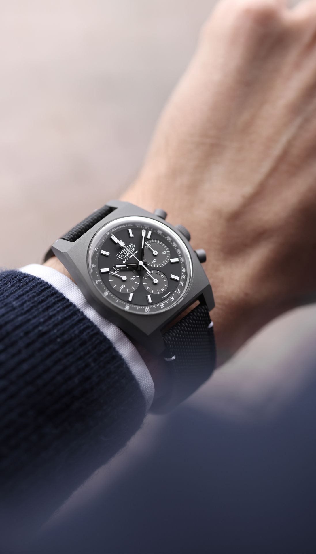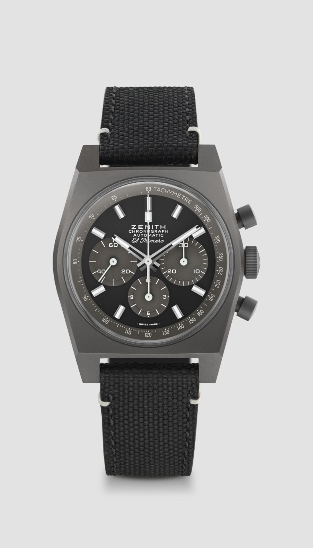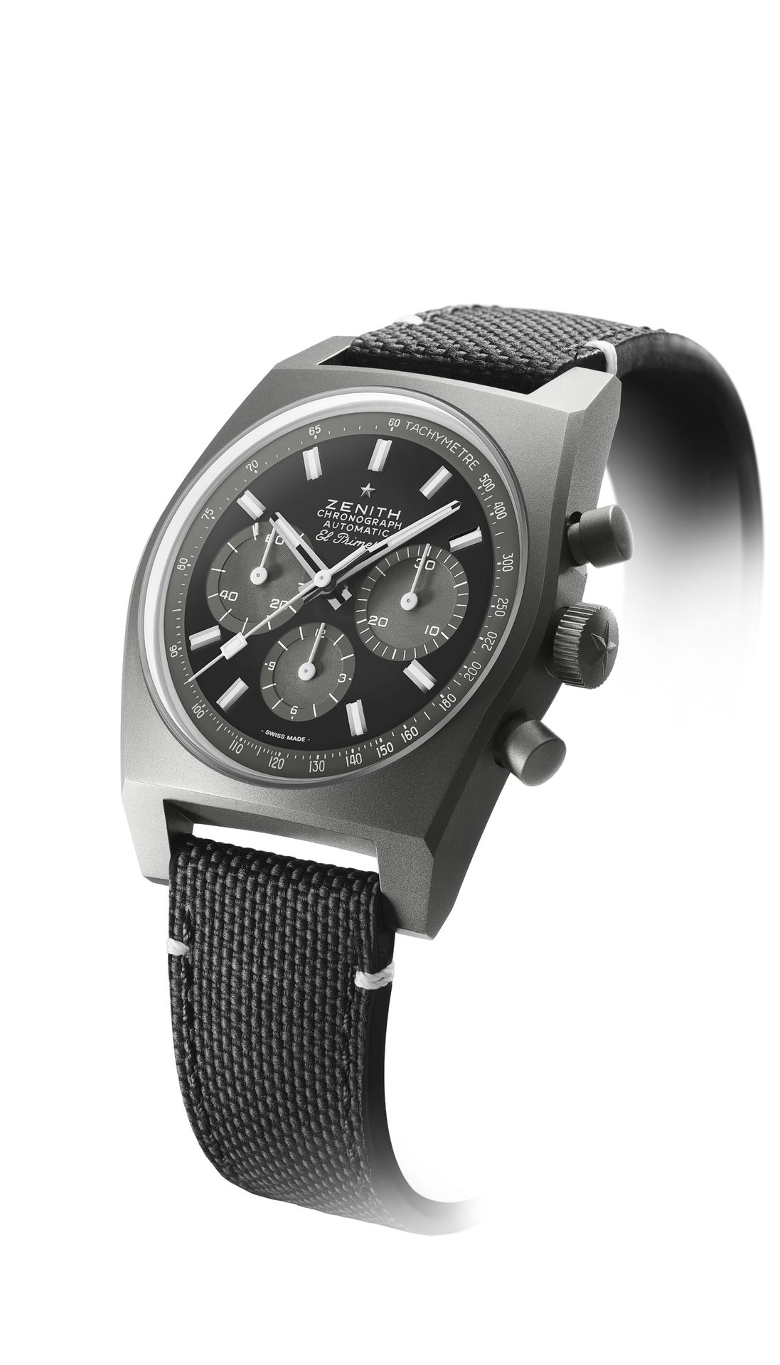 The CHRONOMASTER Revival Shadow mimics the look of an obscure ZENITH chronograph prototype from the 1970s that featured a blackened case. Here, the stealthy look is reproduced with an entirely matte finished titanium case. The black dial foregoes the seconds track and the date window. Paired with a black cordura effect rubber.