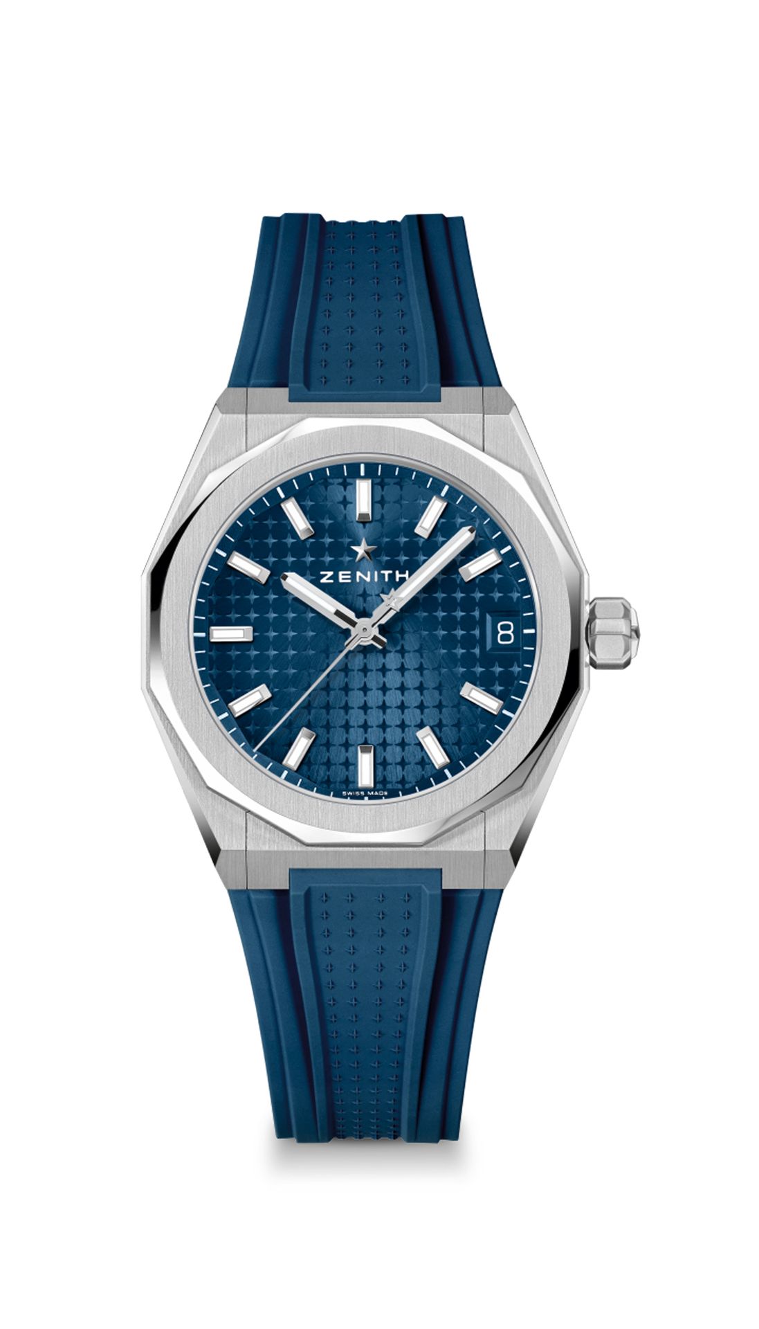 DEFY Skyline in a 36mm steel octagonal case with a faceted bezel, featuring a metallic pastel green sunburst-patterned dial revisiting the emblematic ZENITH four-pointed star. Powered by the Elite 670 automatic manufacture movement. Interchangeable steel bracelet and green patterned rubber strap.