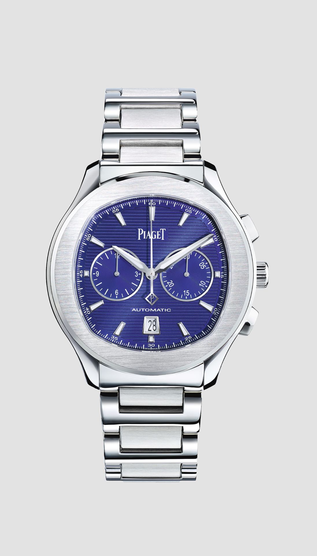 Dynamic and contemporary, this new self-winding chronograph watch has a casual elegance that is ideal for every occasion. Available with a polished and satin-brushed steel bracelet, merging perfectly with its curved case, this masculine chronograph watch has understated lines and is remarkably comfortable to wear. Housed in a case-middle combining round and cushion-shaped forms in the purest Piaget aesthetic tradition, the blue horizontal guilloché dial, divided up by luminescent applied hour-markers, displays hours, minutes and seconds, together with chronograph and date functions.