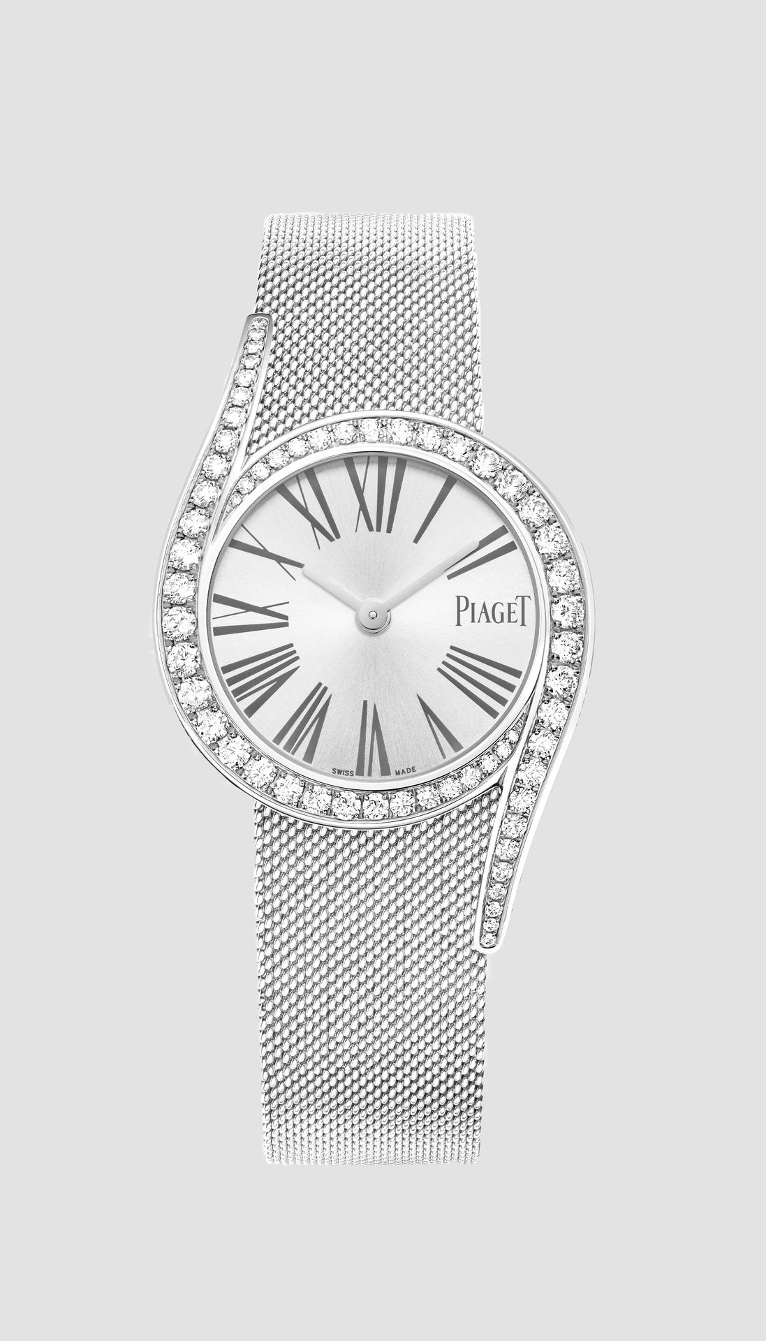Its femininity graces an elegant white gold 26 mm case, continuing into two arched lugs that perfectly embrace the wrist. The sensual bezel set with graduated round-cut diamonds highlights the delicate curves of this women’s watch. The silvered dial with anthracite grey Roman numerals is paired with a woven Milanese mesh bracelet to add to the piece’s refined classicism with contemporary notes.