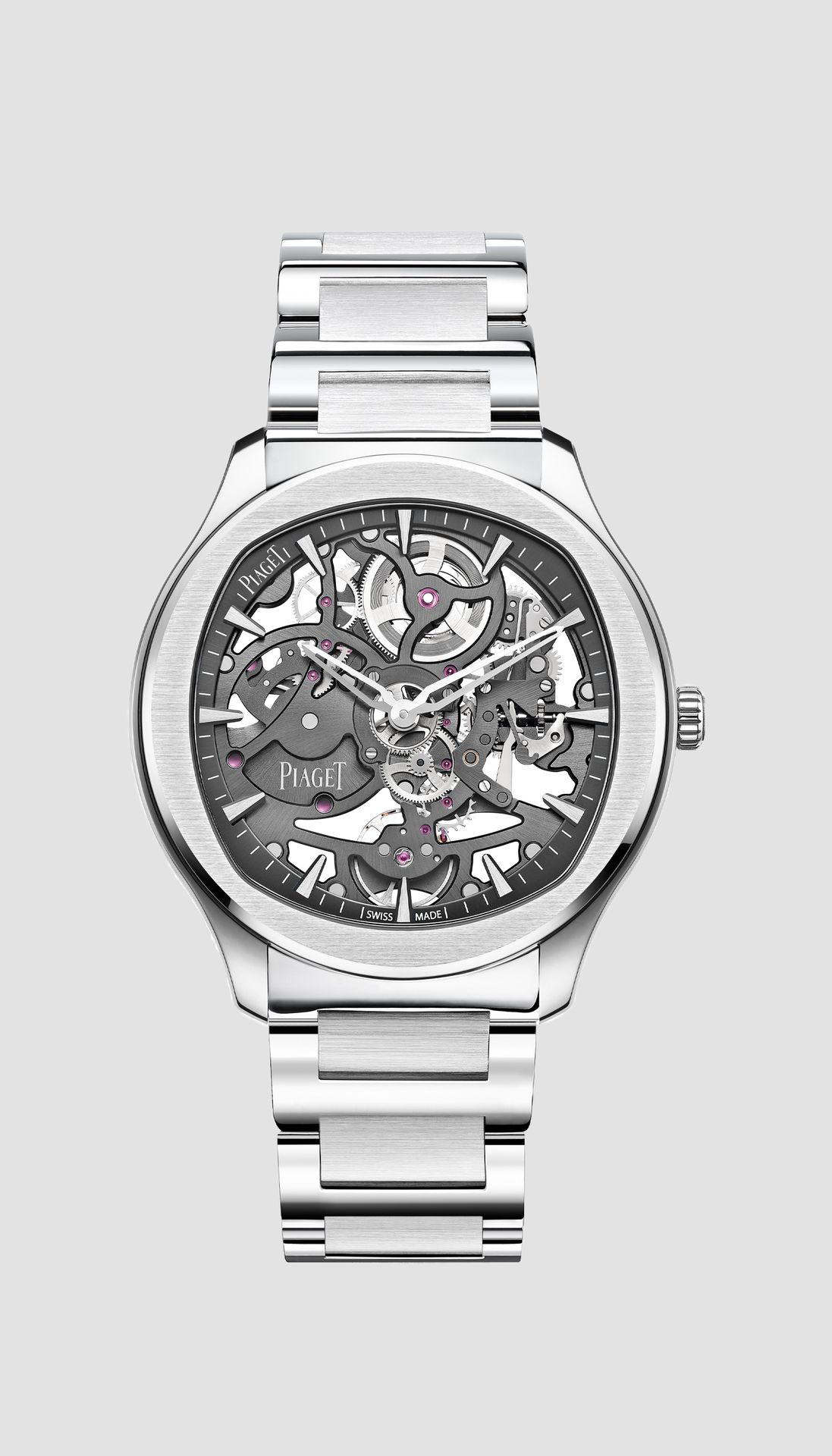 Piaget Polo luxury self-winding watch for men with a sleek steel case and our 1200S1 skeleton movement. Bold, refined and dynamic, this steel watch for men is imbued with a new classic feel and reinvigorated with its skeleton movement, the 1200S1 calibre in a slate grey colour with oscillating weight that sits on the wrist with a pulsating energy.