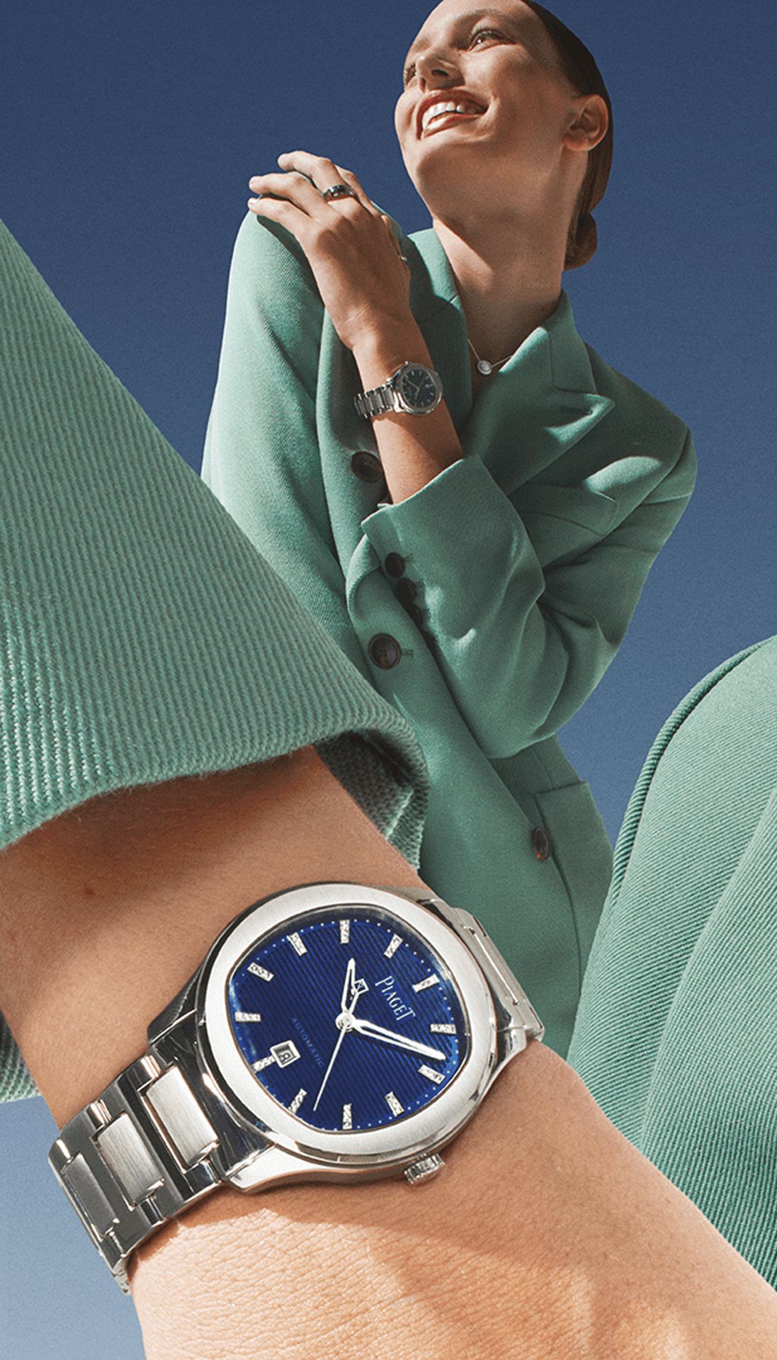 Experience elegance and athletic style in a women’s watch with this 36 mm Piaget Polo Date steel luxury piece. Piaget signatures unite in this Piaget Polo creation. Signature Piaget blue, a steel bracelet and the iconic cushion-shaped dial of the collection, all in a Swiss self-winding watch for women.