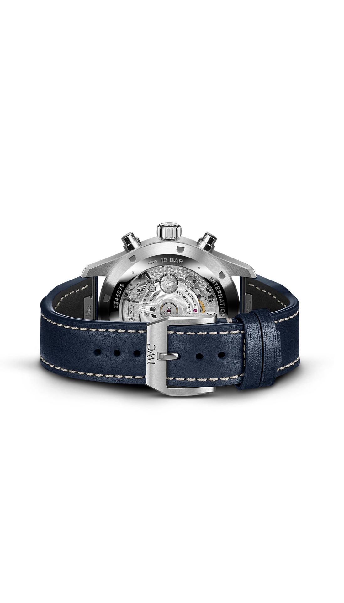 The IWC-manufactured 69385 caliber, a precise and robust chronograph movement in classic column-wheel design, enables measurement of stop or aggregate times of up to 12 hours. The hours are displayed on the counter at 9 o’clock, the minutes at 12 o’clock. The small second features a red hand and is located at 6 o’clock. The self-winding movement with a power reserve of 46 hours is visible through the sapphire glass back.