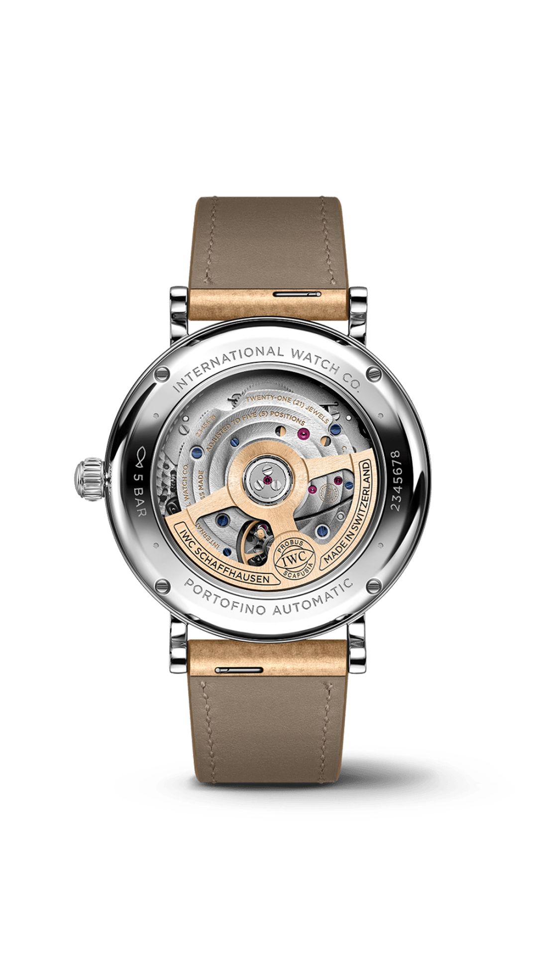 The Portofino Automatic 37 features the IWC-manufactured 32111 caliber and a see-through sapphire glass back displaying the movement.